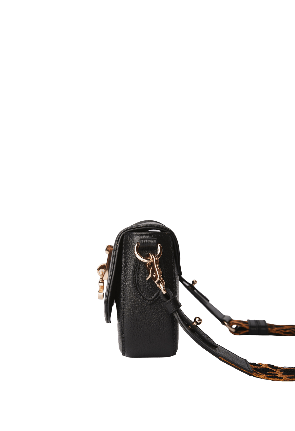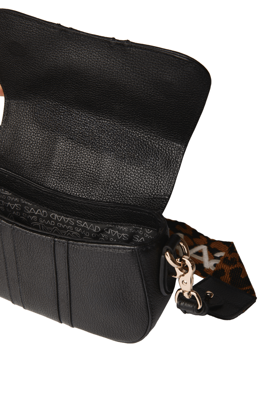 O fechamento frontal recebe uma ferragem dourada com assinatura SAAD, aplicada como um ponto de luz — sutil, mas impossível de passar despercebida. A aba suavemente arredondada equilibra força e feminilidade, o que cria um visual atemporal.O destaque fica por conta da alça transversal em tear com estampa de onça, ajustável e removível, que imprime personalidade à peça e permite a troca com alças avulsas. Uma bolsa pensada para acompanhar quem sabe que estilo é identidade.