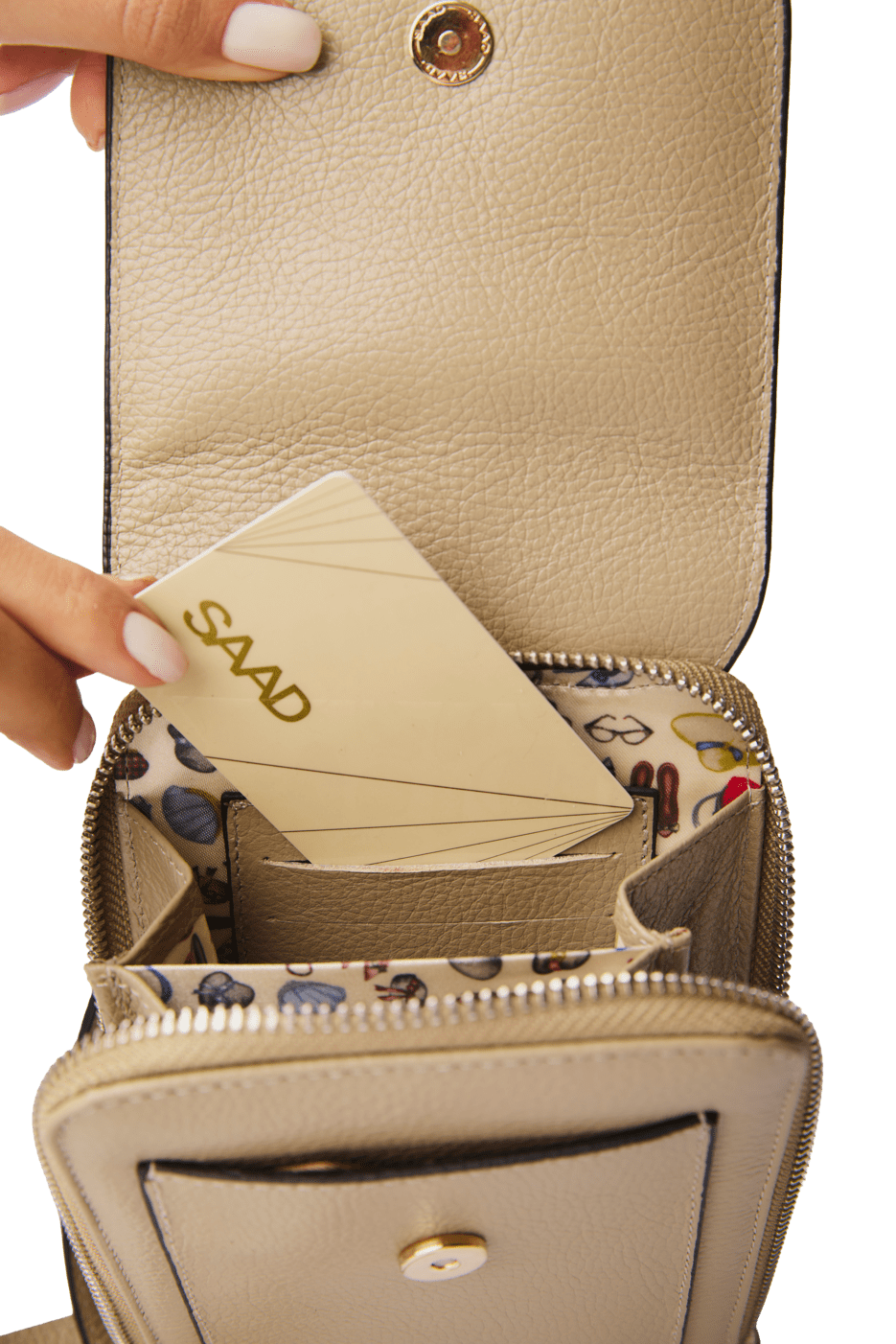 Perfeita para uso durante o dia ou à noite. Uma divisão inteira para celular, e outra para você organizar seus cartões e documentos. Se completa com prático bolso externo e jogo de letras SAAD. Você certamente vai querer ter a sua para completar suas produções.